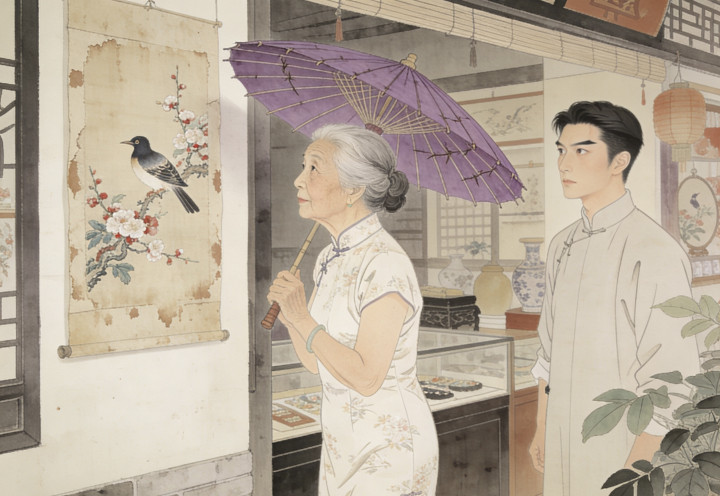 这日傍晚,雨势渐大,叶临风正准备打烊,一位身着素色旗袍的老妇人缓步走进店里。她约莫六十来岁,头发梳得一丝不苟,手中拿着一把紫竹伞,伞柄上雕刻着精细的竹叶纹。
