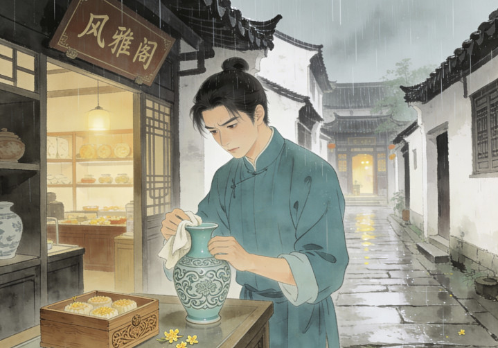江南水乡的梅雨时节,细雨如织。青石巷深处,一家名为“风雅阁”的古玩店里,年轻老板叶临风正仔细擦拭着一只青瓷花瓶。他面容俊朗,剑眉星目,却总是眉头微蹙,仿佛有心事萦绕。